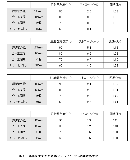 実験の結果、表1を得た。注射器の設置角度を変えると、それに伴って注射器のストローク量と運動周期はそれぞれ増す傾向にある。これは、注射器が支点を中心に円運動を行なっているので、それを持ち上げる注射器に角度が付いている方が試験管を持ち上げる力が加わりやすいからだと考えられる。また、試験管の径が大きいほど空気の量が増え、ビー玉の数が多いほど移動する空気の量が増えるので、空気の膨張・収縮量も多くなり、注射器のストロークが長くなると考えられる。しかし、結果は、21oφの試験管のストロークが一番大きかった。これは、試験管内の空気量が多いと、空気の膨張が大きく、注射器のシリンダーの位置が上がってしまうことによって、試験管の支点の位置も上げなくてはならず、そのためにアルコールランプの炎から試験管が遠ざかることによって加熱量が少なくなると考えられる。加熱量が少なくなると高温部の温度が下がり、高温部と低温部の温度差が小さくなり、空気の膨張と収縮の差も減っていくことになる。