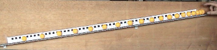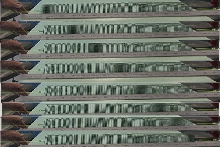縦波の運動は横波に較べて,理解しにくい運動である.バネを使用すると,縦波の運動を見ることができるが,大きく柔らかいバネを用いないと,変化が速すぎて観察しにくい.図7はDVカメラで撮影した画像を1/10秒間隔で、順番に貼り付けたものである.縦波が移動していく様子がよく分かる.