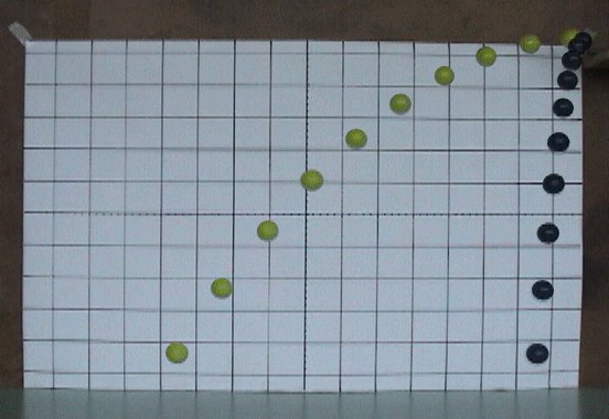 自然落下運動は速度が速く,その変化の様子を目で追うことは不可能であるが,DVカメラで撮った画像をスロー再生したり,図10のように画像処理することにより,落下するに従がって速さが速くなる様子がよく分かる.この画面の格子目は10cm間隔で、ボールは1/30秒間隔で表示している。