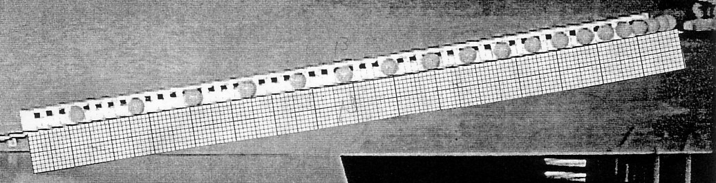 図8では斜面の背後に1cm間隔で白黒に塗り分けた用紙を貼って速度の変化を実感しやすくしたが,速度の変化を定量的に観察する目的には不十分であった.定量的に加速度を計算する場合は,作成した画面へ,後ほど,図9のようにスケールを貼り付けて距離の変化をスケールの目盛りから読みとり,実際の距離は実測値とスケールの目盛りとの比率を求めて,比例計算するという方法を採った.