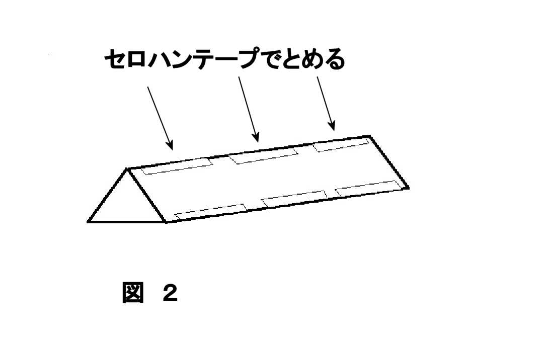 4.プラスチック鏡のきれいな面を内側におりまげて三角形の筒を作り、鏡のはしを合わせて、図2のようにセロハンテープでとめます。