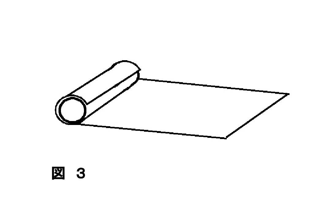 6.大きい方の工作用紙の短い辺のはしから、図3のようにクッキングフィルムの筒のような物に巻きつけ、まるい筒を作ります。