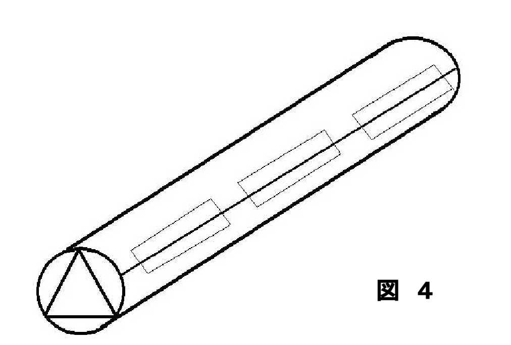 9.巻き付けた工作用紙を両手でもって、三角形の鏡がぴったり入るように、工作用紙をまるめて太さを調節し、はしをきれいにそろえて、図4のように工作用紙のはしをセロハンテープでとめ、万華鏡の筒を作ります。