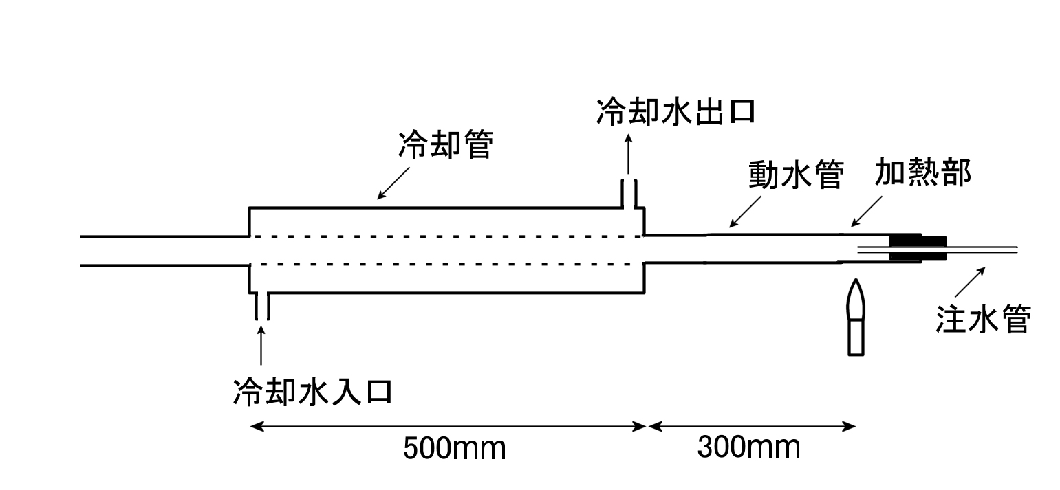 この装置では注水槽内の水は注水管を通って加熱部へ通じており、加熱部で蒸気が発生して、管内の圧力が高くなると、