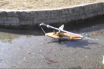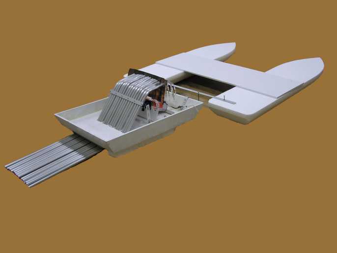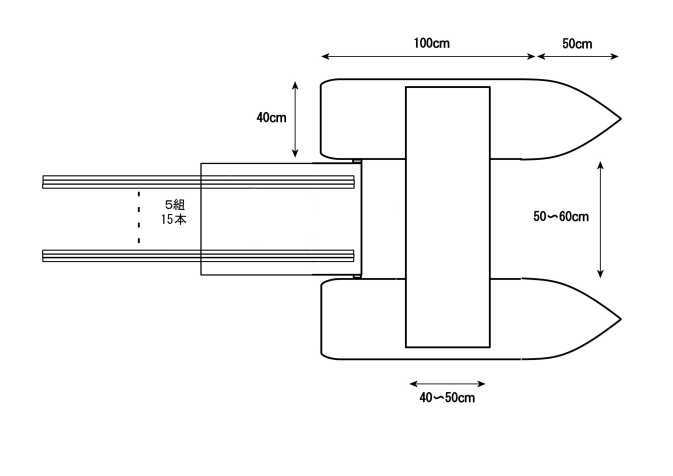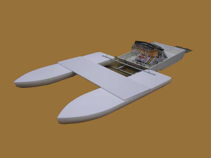 さらに、人が乗るので、安定性が良い船体を作らなければならない。このような条件を満足させるために、人が乗る船体部分は発泡スチロール製の双胴船とし、