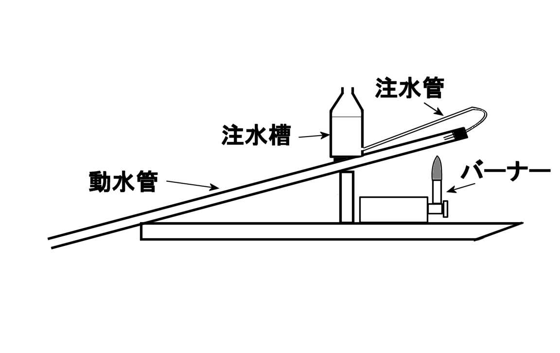 加熱部の上部より注水管を挿入し、注水槽と注水管は軟質ビニールパイプで繋いだ。 加熱には携帯ガスボンベに着けるバーナーを用いた。