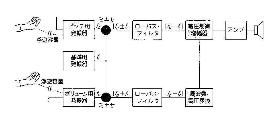 いま、ピッチ用アンテナに手を近づけると、手とアンテナの間の浮遊容量が変化し、発振器の回路に浮遊容量分のCが加わり、発振周波数が変化する。こうして変化した波と基準の波をミキサーで混合すると、ヘテロダイン干渉によって、その周波数の差成分がいわゆる「うなり」の波となって得られる。したがって、その差周波数が可聴周波数帯になるように調整すれば、音として聞くことができる。