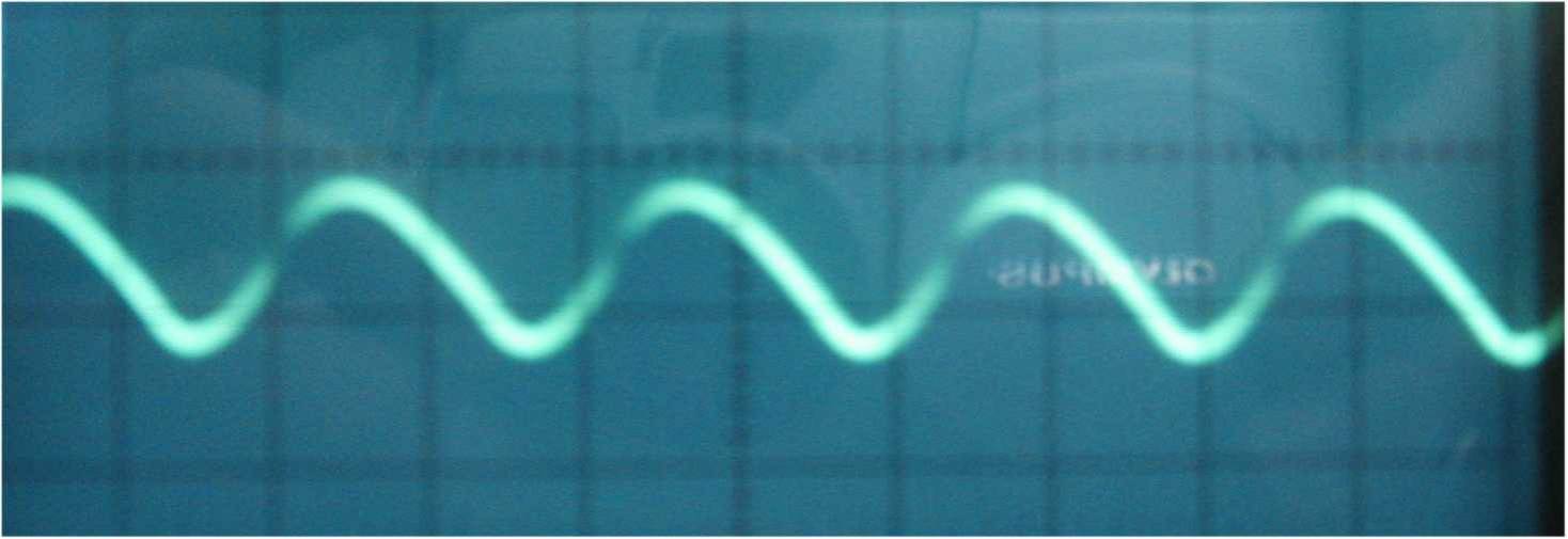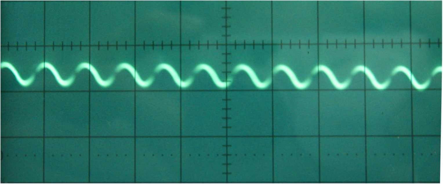 図3は発振回路で作られた、基準周波数用とピッチ用の矩形波で両波形を重ねて表示しているが、波長の差はこの画面ではほとんど確認できない。この画面は1μs/divであるので、この波の周波数は約200kHzである。基準波とピッチ波のNANDを取って、積分回路を通した後の出力は図3、図4のような波になっている。図4はアンテナと手との距離が離れている場合で図5は手を近づけた場合である。この画面は1ms/divであるので、図4は周波数が約500Hz、図5は約1000Hzの波であることがわかる。このようにピッチ用の周波数のわずかな変化で、テルミンの出力周波数は変化する