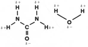 尿素は図4のように分極しているため、水分子とは水素結合によって、図5のように結び付く性質があり保水能力が高い。